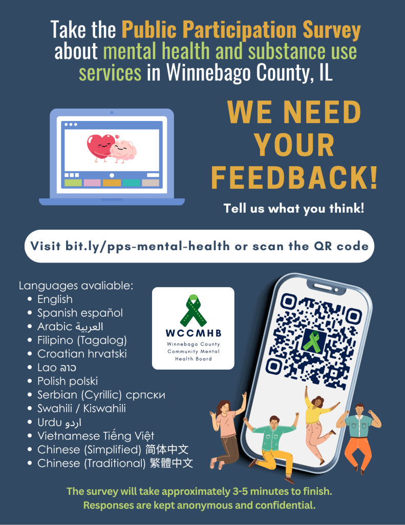 Residents, providers, clients, and community partners are asked to take a short Public Participation Survey to help guide the future of mental health and substance use services in our county. Your input helps identify gaps, improve access, and strengthen supports for everyone who calls Winnebago County home.